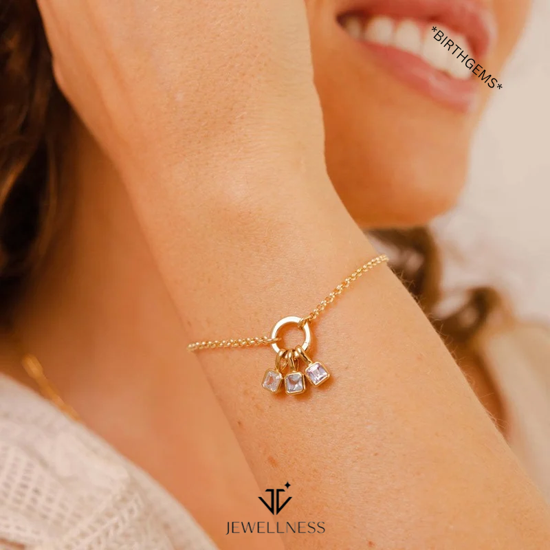 Crafted from stainless steel with 18K gold plating, these lightweight 0.5g, 1.2cm x 0.7cm charms shine with timeless beauty and everyday durability. Each piece can be clipped onto our versatile necklace or bracelet, allowing you to wear a single BirthGem or mix and match with zodiac signs, letters, numbers, and other charms to create a piece uniquely yours.